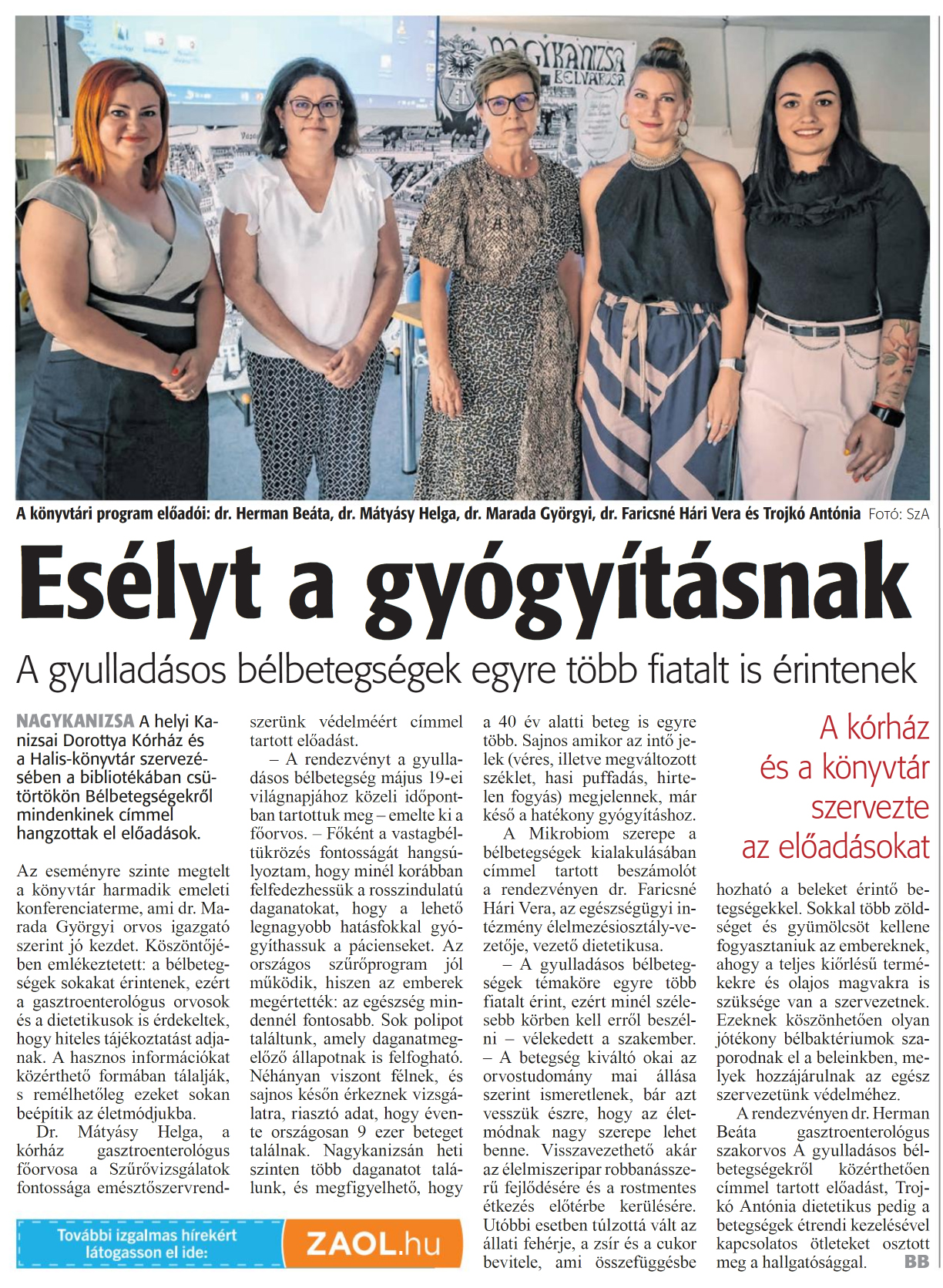 Nyilvános 963 | 904 | Zalai Hírlap 2024. június 22. 144. szám 2. oldal | A könyvtári program előadói: dr. Hermán Beáta, dr. Mátyásy Helga, dr. Marada Györgyi, dr. Faricsné Hári Vera és Trojkó Antónia Fotó: SzA Esélyt a gyógyításnak A gyulladásos bélbetegségek egyre több fiatalt is érintenek NAGYKANIZSA A helyi Kanizsai Dorottya Kórház és a Halis-könyvtár szervezésében a bibliotékában csütörtökön Bélbetegségekről mindenkinek címmel hangzottak el előadások. Az eseményre szinte megtelt a könyvtár harmadik emeleti konferenciaterme, ami dr. Marada Györgyi orvos igazgató szerint jó kezdet. Köszöntőjében emlékeztetett: a bélbetegségek sokakat érintenek, ezért a gasztroenterológus orvosok és a dietetikusok is érdekeltek, hogy hiteles tájékoztatást adjanak. A hasznos információkat közérthető formában tálalják, s remélhetőleg ezeket sokan beépítik az életmódjukba. Dr. Mátyásy Helga, a kórház gasztroenterológus főorvosa a Szűrővizsgálatok fontossága emésztőszervrendszerünk védelméért címmel tartott előadást. - A rendezvényt a gyulladásos bélbetegség május 19-ei világnapjához közeli időpontban tartottuk meg - emelte ki a főorvos. - Főként a vastagbéltükrözés fontosságát hangsúlyoztam, hogy minél korábban felfedezhessük a rosszindulatú daganatokat, hogy a lehető legnagyobb hatásfokkal gyógyíthassuk a pácienseket. Az országos szürőprogram jól működik, hiszen az emberek megértették: az egészség mindennél fontosabb. Sok polipot találtunk, amely daganatmegelőző állapotnak is felfogható. Néhányan viszont félnek, és sajnos későn érkeznek vizsgálatra, riasztó adat, hogy évente országosan 9 ezer beteget találnak. Nagykanizsán heti szinten több daganatot találunk, és megfigyelhető, hogy a 40 év alatti beteg is egyre több. Sajnos amikor az intő jelek (véres, illetve megváltozott széklet, hasi puffadás, hirtelen fogyás) megjelennek, már késő a hatékony gyógyításhoz. A Mikrobiom szerepe a bélbetegségek kialakulásában címmel tartott beszámolót a rendezvényen dr. Faricsné Hári Vera, az egészségügyi intézmény élelmezésiosztály-vezetője, vezető dietetikusa. - A gyulladásos bélbetegségek témaköre egyre több fiatalt érint, ezért minél szélesebb körben kell erről beszélni - vélekedett a szakember. - A betegség kiváltó okai az orvostudomány mai állása szerint ismeretlenek, bár azt vesszük észre, hogy az életmódnak nagy szerepe lehet benne. Visszavezethető akár az élelmiszeripar robbanásszerű fejlődésére és a rostmentes étkezés előtérbe kerülésére. Utóbbi esetben túlzottá vált az állati fehérje, a zsír és a cukor bevitele, ami összefüggésbe hozható a beleket érintő betegségekkel. Sokkal több zöldséget és gyümölcsöt kellene fogyasztaniuk az embereknek, ahogy a teljes kiőrlésű termékekre és olajos magvakra is szüksége van a szervezetnek. Ezeknek köszönhetően olyan jótékony bélbaktériumok szaporodnak el a beleinkben, melyek hozzájárulnak az egész szervezetünk védelméhez. A rendezvényen dr. Hermán Beáta gasztroenterológus szakorvos A gyulladásos bélbetegségekről közérthetően címmel tartott előadást, Trojkó Antónia dietetikus pedig a betegségek étrendi kezelésével kapcsolatos ötleteket osztott meg a hallgatósággal. BB |