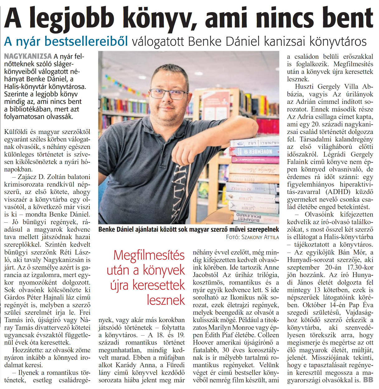 Nyilvános 721 | 1042 | Zalai Hírlap 2024. szeptember 9. 210. szám 2. oldal | A legjobb könyv, ami nincs bent NAGYKANIZSA A nyár felnőtteknek szóló slágerkönyveiből válogatott néhányat Benke Dániel, a Halis-könyvtár könyvtárosa. Szerinte a legjobb könyv mindig az, ami nincs bent a bibliotékában, mert azt folyamatosan olvassák. Külföldi és magyar szerzőktől egyaránt széles körben válogatnak olvasóik, s néhány egészen különleges történetet is szívesen kikölcsönöztek a nyári hónapokban. - Zajácz D. Zoltán balatoni krimisorozata rendkívül népszerű, az első kötete, ahogy visszaér a könyvtárba egy olvasótól, a következő már viszi is ki - mondta Benke Dániel. - Jó bűnügyi regények, ráadásul a magyarok kedvenc tava mellett játszódnak hazai szereplőkkel. Szintén kedvelt bűnügyi szerzőnk Réti László, aki tavaly Nagykanizsán is járt. Az ő személye azért is garancia az izgalomra, mert egykor nyomozóként dolgozott. Sok olvasónk kölcsönözte ki Gárdos Péter Hajnali láz című regényét is, melyben a szerző szülei szerelmét írja le. Frei Tamás író, újságíró vagy Náray Tamás divattervező kötetei ugyancsak évszaktól függetlenül évek óta keresettek. Hozzátette: az olvasók zöme nyáron inkább a könnyed irodalmat keresi. - Ilyenek a romantikus történetek, esetleg családregények, vagy akár más korokban játszódó történetek - folytatta a könyvtáros. - A 18. és 19. századi romantikus történet megunhatatlan, mindig kedvelt marad. Ebben a műfajban alkot Karády Anna, a Füredi lány című könyvvel kezdődő sorozata hiába jelent meg már néhány évvel ezelőtt, még mindig kifejezetten kedvelt olvasóink körében. Ide tartozik Anne Jacobstól Az úriház trilógia, kosztümös, romantikus és a nyár egyik kedvence lett. S ide sorolható az Ikonikus nők sorozat, ezek életrajzi regények, melyek beengedik az olvasót a kulisszák mögé. Például a titokzatos Marilyn Monroe vagy éppen Edith Piaf életébe. Colleen Hoover amerikai újságírónő a fiatalabb, 30 éves korosztálynak is ír mélyebb tartalmú romantikus regényeket. Velünk véget ér című bestseller könyvéből nemrég film készült, ami a családon belüli erőszakkal is foglalkozik. Megfilmesítés után a könyvek újra keresettek lesznek. Huszti Gergely Villa Abbázia, vagyis Az úrilányok az Adrián címmel indított sorozatot. Ennek második része Az Adria csillaga címet kapta, ami egy 20. századi nagykanizsai család történetét dolgozza fel. Társadalmi kalandregény az első világháború előtti időszakról. Légrádi Gergely Falaink című könyve nem éppen könnyed olvasnivaló, de érdemes rá időt szánni: egy figyelemhiányos hiperaktivitás-zavarral (ADHD) küzdő gyermeket nevelő csonka család életébe enged betekintést. - Olvasóink kifejezetten kedvelik az író-olvasó találkozókat, s most ősszel két szerző is ellátogat a Halis-könyvtárba - tájékoztatott a könyvtáros. - Az egyikőjük Bán Mór, a Hunyadi-sorozat szerzője, aki szeptember 20-án 17.30-kor jön hozzánk. Az író Hunyadi János életét dolgozta fel mintegy 13 kötetben, ezek is népszerűek látogatóink körében. Október 14-én Pap Éva szegedi születésű, Vajdasághoz kötődő szerző érkezik a könyvtárba, aki szenvedélyesen törekszik arra, hogy megismerje és megértse az ott élő magyarok életét, múltját, jelenét. Missziójának tekinti, hogy e tapasztalásait regényein keresztül megossza a magyarországi olvasókkal is. BB A nyár bestsellereiből válogatott Benke Dániel kanizsai könyvtáros Benke Dániel ajánlatai között sok magyar szerző művei szerepelnek Fotó: Szakony Attila |