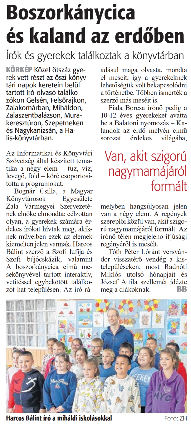 Nyilvános 677 | 833 | Zalai Hírlap 2024. október 31. 254. szám 6. oldal | Boszorkánycica és kaland az erdőben írók és gyerekek találkoztak a könyvtárban KÖRKÉP Közel ötszáz gyerek vett részt az őszi könyvtári napok keretein belül tartott író-olvasó találkozókon Gelsén, Felsőrajkon, Zalakomárban, Miháldon, Zalaszentbalázson, Murakeresztúron, Szepetneken és Nagykanizsán, a Halis-könyvtárban. Az Informatikai és Könyvtári Szövetség által készített tematika a négy elem - tüz, víz, levegő, föld - köré csoportosította a programokat. Bognár Csilla, a Magyar Könyvtárosok Egyesülete Zala Vármegyei Szervezetének elnöke elmondta: célzottan olyan, a gyerekek számára érdekes írókat hívtak meg, akiknek műveiben ezek az elemek kiemelten jelen vannak. Harcos Bálint szerző a Szofi lufija és Szofi bújócskázik, valamint A boszorkánycica című mesekönyvével tartott interaktív, vetítéssel egybekötött találkozót hat településen. Az író rá- adásul maga olvasta, mondta el meséit, így a gyerekeknek lehetőségük volt bekapcsolódni a történetbe. Többen ismerték a szerző más meséit is. Fiala Borcsa írónő pedig a 10-12 éves gyerekeket avatta be a Balatoni nyomozás - Kalandok az erdő mélyén című sorozat érdekes világába, melyben hangsúlyosan jelen van a négy elem. A regények szereplői közül van, akit szigorú nagymamájáról formált. Az írónő télen megjelenő ifjúsági regényéről is mesélt. Tóth Péter Lóránt versvándor visszatérő vendég a kistelepüléseken, most Radnóti Miklós utolsó hónapjait és József Attila szellemét idézte meg a diákoknak. BB Harcos Bálint író a miháldi iskolásokkal Fotó: ZH |