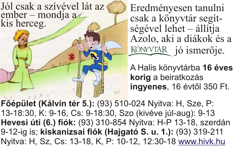 Nyilvános 916 | 2252 | Jól csak a szívével lát az ember – mondja a kis herceg. | Eredményesen tanulni csak a könyvtár segítségével lehet – állítja Azolo, aki a diákok és a könyvtár jó ismerője. A Halis könyvtárba 16 éves korig a beiratkozás ingyenes, 16 évtől 350 Ft. Főépület (Kálvin tér 5.): (93) 510-024 Nyitva: H, Sze, P: 13-18:30, K: 9-16, Cs: 9-18:30, Szo (kivéve júl-aug): 9-13 Hevesi úti (6.) fiók: (93) 310-854 Nyitva: H-P 13-18, szerdán 9-12-ig is; kiskanizsai fiók (Hajgató S. u. 1.): (93) 319-211 Nyitva: H, Sz, Cs: 13-18, K, P: 10-12, 12:30-18 www.hivk.hu |