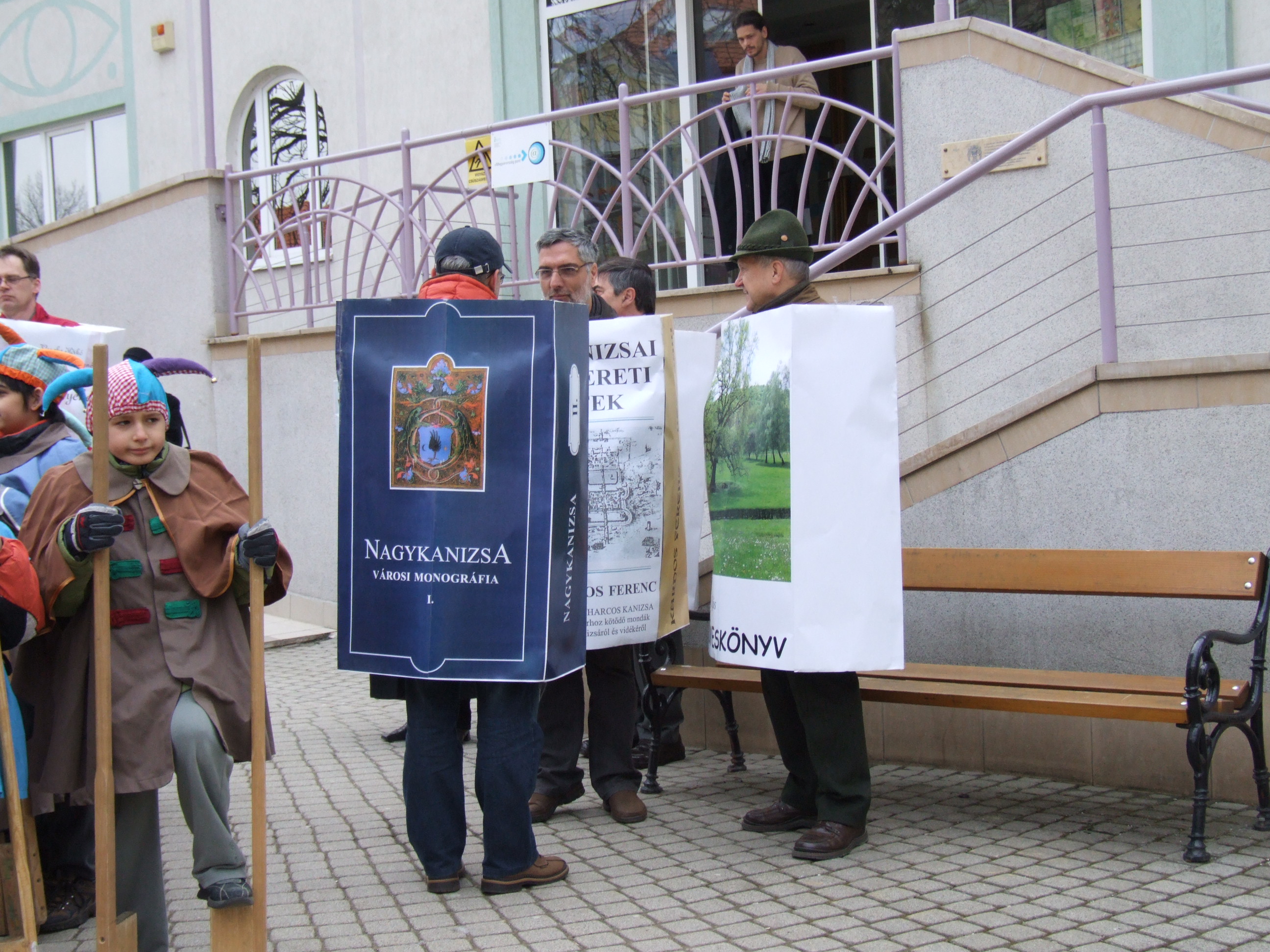Nyilvános 1170 | 2572 | 2013. február 9. A farsangi fánkfesztiválra készülve felhívásban kértük olvasóinkat, hogy öltsék magukra kedves könyvüket. Egy „könyvespolcnyi” jelentkező vette magára kedves olvasmányát, az ő vonulásukról készültek ezek a képek. A környezetükben néhol láthatók a Nagykanizsai Gólyalábasok, akik szintén a könyvtárhoz kötődnek. A „felvonuló kötetek” a könyvtár épületében még megtekinthetők. | |