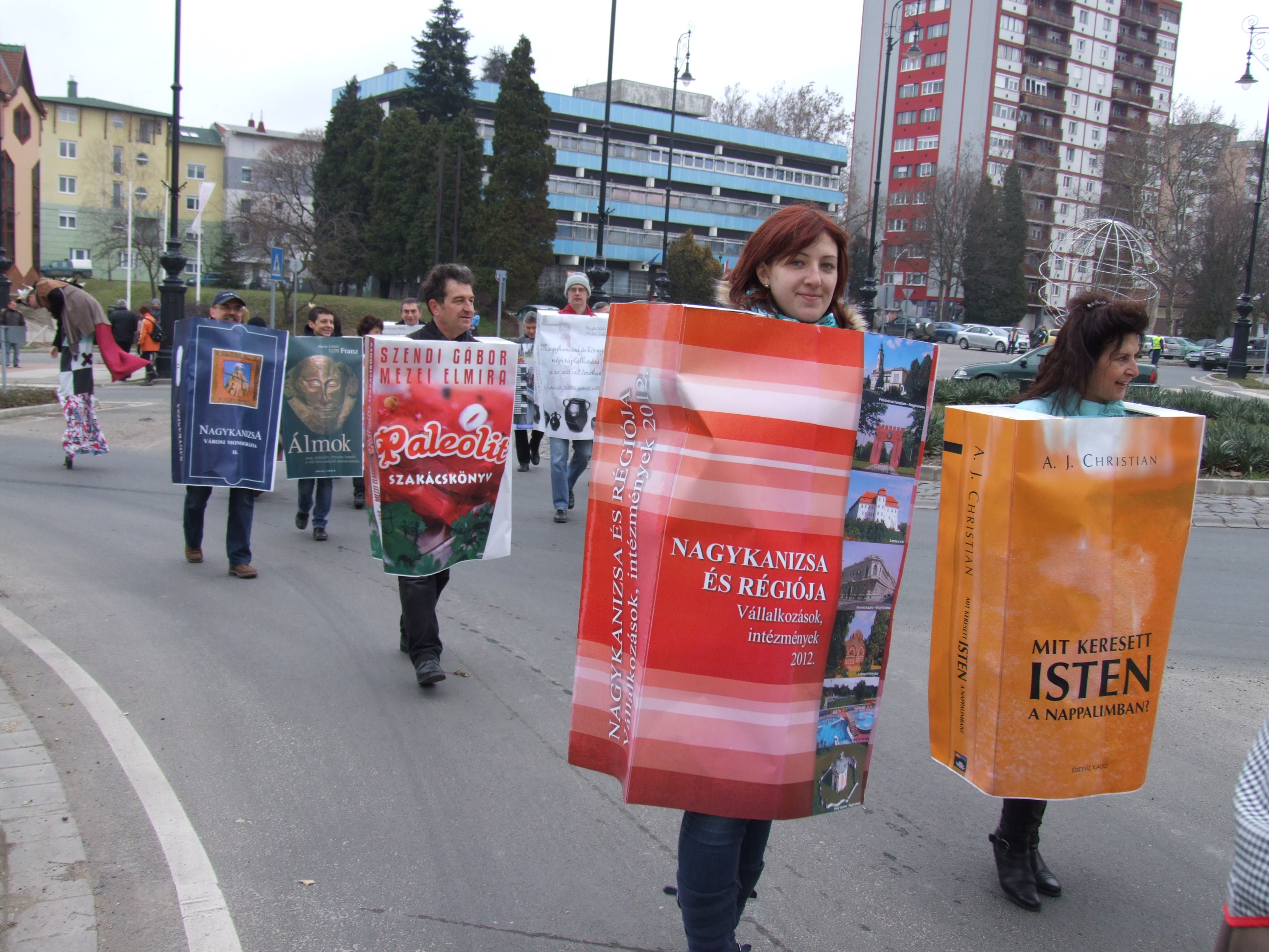 Nyilvános 847 | 1258 | 2013. február 9. A farsangi fánkfesztiválra készülve felhívásban kértük olvasóinkat, hogy öltsék magukra kedves könyvüket. Egy „könyvespolcnyi” jelentkező vette magára kedves olvasmányát, az ő vonulásukról készültek ezek a képek. A környezetükben néhol láthatók a Nagykanizsai Gólyalábasok, akik szintén a könyvtárhoz kötődnek. A „felvonuló kötetek” a könyvtár épületében még megtekinthetők. | |