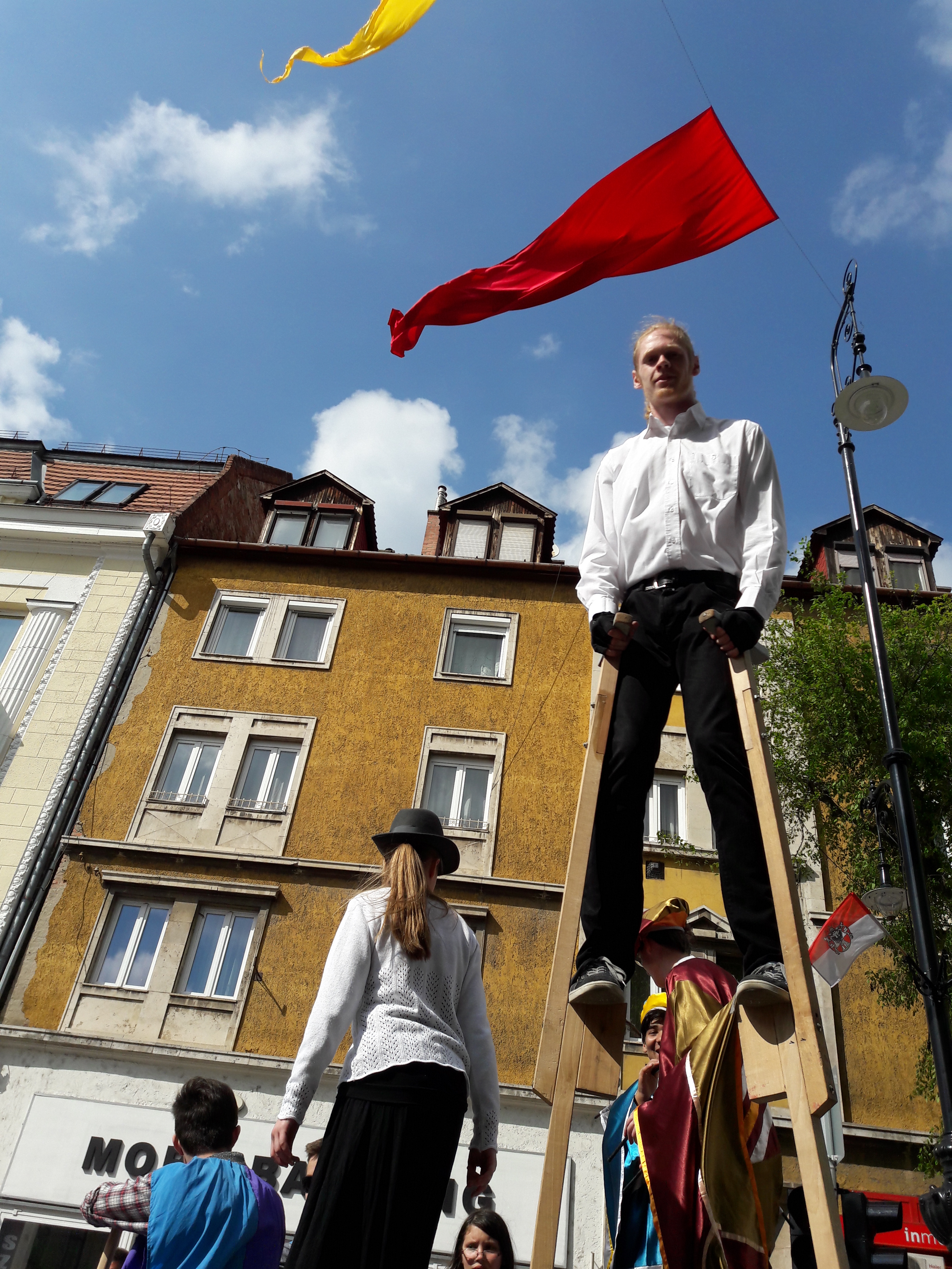 2017.04.30. Utca Tánc Fesztivál - Vonulás - Gólyalábasok, fekete kalapos táncosok, meridián tornások