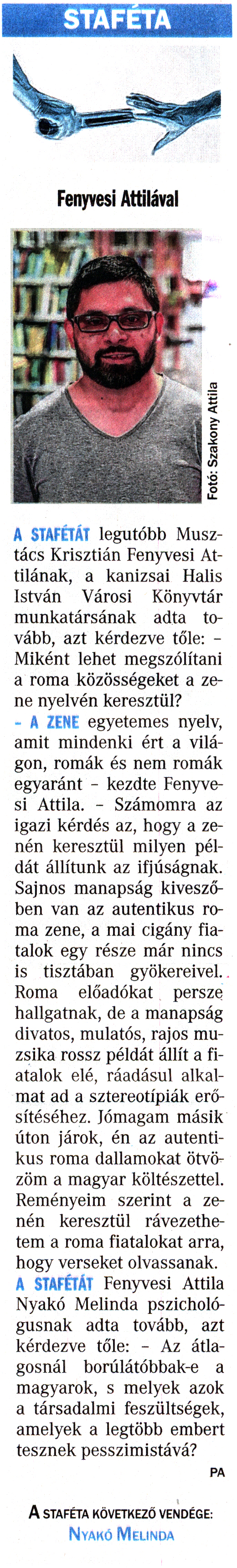 Nyilvános 1568 | 4286 | Vasárnapi Zalai Hírlap 2017. június 3. 22. szám 5. oldal | STAFÉTA Fenyvesi Attilával A STAFÉTÁT legutóbb Musztács Krisztián Fenyvesi Attilának, a kanizsai Halis István Városi Könyvtár munkatársának adta tovább, azt kérdezve tőle: - Miként lehet megszólítani a roma közösségeket a zene nyelvén keresztül? - A ZENE egyetemes nyelv, amit mindenki ért a világon, romák és nem romák egyaránt - kezdte Fenyvesi Attila. - Számomra az igazi kérdés az, hogy a zenén keresztül milyen példát állítunk az ifjúságnak. Sajnos manapság kiveszőben van az autentikus roma zene, a mai cigány fiatalok egy része már nincs is tisztában gyökereivel. Roma előadókat persze hallgatnak, de a manapság divatos, mulatós, rajos muzsika rossz példát állít a fiatalok elé, ráadásul alkalmat ad a sztereotípiák erősítéséhez. Jómagam másik úton járok, én az autentikus roma dallamokat ötvözöm a magyar költészettel. Reményeim szerint a zenén keresztül rávezethetem a roma fiatalokat arra, hogy verseket olvassanak. A STAFÉTÁT Fenyvesi Attila Nyakó Melinda pszichológusnak adta tovább, azt kérdezve tőle: - Az átlagosnál borúlátóbbak-e a magyarok, s melyek azok a társadalmi feszültségek, amelyek a legtöbb embert tesznek pesszimistává? PA A STAFÉTA KÖVETKEZŐ VENDÉGE: Nyakó Melinda |