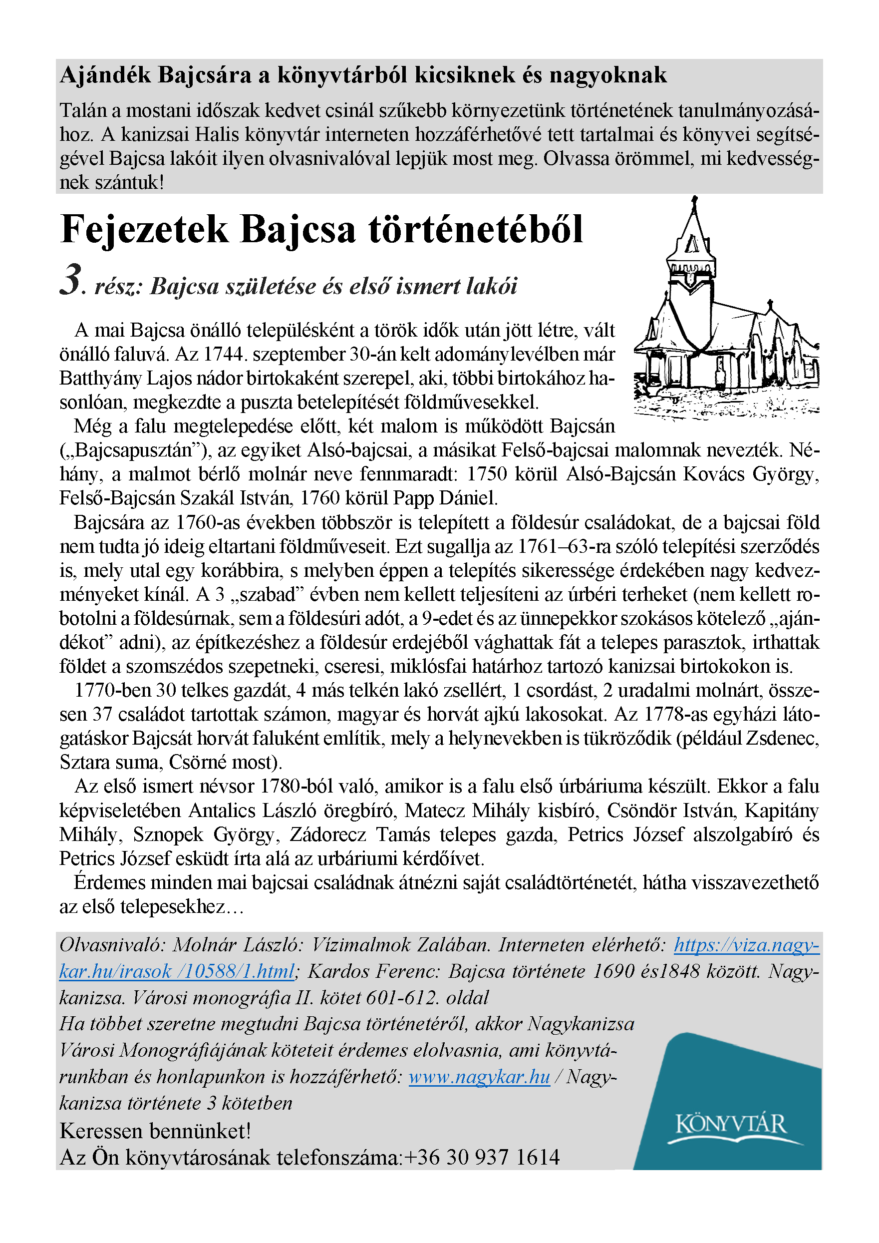 Nyilvános 1598 | 2743 | Megjelent: 2021. április 23. | Ajándék Bajcsára a könyvtárból kicsiknek és nagyoknak Talán a mostani időszak kedvet csinál szűkebb környezetünk történetének tanulmányozásához. A kanizsai Halis könyvtár interneten hozzáférhetővé tett tartalmai és könyvei segítségével Bajcsa lakóit ilyen olvasnivalóval lepjük most meg. Olvassa örömmel, mi kedvességnek szántuk! Fejezetek Bajcsa történetéből 3. rész: Bajcsa születése és első ismert lakói A mai Bajcsa önálló településként a török idők után jött létre, vált önálló faluvá. Az 1744. szeptember 30-án kelt adománylevélben már Batthyány Lajos nádor birtokaként szerepel, aki, többi birtokához hasonlóan, megkezdte a puszta betelepítését földművesekkel. Még a falu megtelepedése előtt, két malom is működött Bajcsán („Bajcsapusztán”), az egyiket Alsó-bajcsai, a másikat Felső-bajcsai malomnak nevezték. Néhány, a malmot bérlő molnár neve fennmaradt: 1750 körül Alsó-Bajcsán Kovács György, Felső-Bajcsán Szakál István, 1760 körül Papp Dániel. Bajcsára az 1760-as években többször is telepített a földesúr családokat, de a bajcsai föld nem tudta jó ideig eltartani földműveseit. Ezt sugallja az 1761–63-ra szóló telepítési szerződés is, mely utal egy korábbira, s melyben éppen a telepítés sikeressége érdekében nagy kedvezményeket kínál. A 3 „szabad” évben nem kellett teljesíteni az úrbéri terheket (nem kellett robotolni a földesúrnak, sem a földesúri adót, a 9-edet és az ünnepekkor szokásos kötelező „ajándékot” adni), az építkezéshez a földesúr erdejéből vághattak fát a telepes parasztok, irthattak földet a szomszédos szepetneki, cseresi, miklósfai határhoz tartozó kanizsai birtokokon is. 1770-ben 30 telkes gazdát, 4 más telkén lakó zsellért, 1 csordást, 2 uradalmi molnárt, összesen 37 családot tartottak számon, magyar és horvát ajkú lakosokat. Az 1778-as egyházi látogatáskor Bajcsát horvát faluként említik, mely a helynevekben is tükröződik (például Zsdenec, Sztara suma, Csörné most). Az első ismert névsor 1780-ból való, amikor is a falu első úrbáriuma készült. Ekkor a falu képviseletében Antalics László öregbíró, Matecz Mihály kisbíró, Csöndör István, Kapitány Mihály, Sznopek György, Zádorecz Tamás telepes gazda, Petrics József alszolgabíró és Petrics József esküdt írta alá az urbáriumi kérdőívet. Érdemes minden mai bajcsai családnak átnézni saját családtörténetét, hátha visszavezethető az első telepesekhez… Olvasnivaló: Molnár László: Vízimalmok Zalában. Interneten elérhető: https://viza.nagykar.hu/irasok /10588/1.html; Kardos Ferenc: Bajcsa története 1690 és1848 között. Nagykanizsa. Városi monográfia II. kötet 601-612. oldal Ha többet szeretne megtudni Bajcsa történetéről, akkor Nagykanizsa Városi Monográfiájának köteteit érdemes elolvasnia, ami könyvtá- runkban és honlapunkon is hozzáférhető: www.nagykar.hu / Nagy- kanizsa története 3 kötetben Keressen bennünket! |