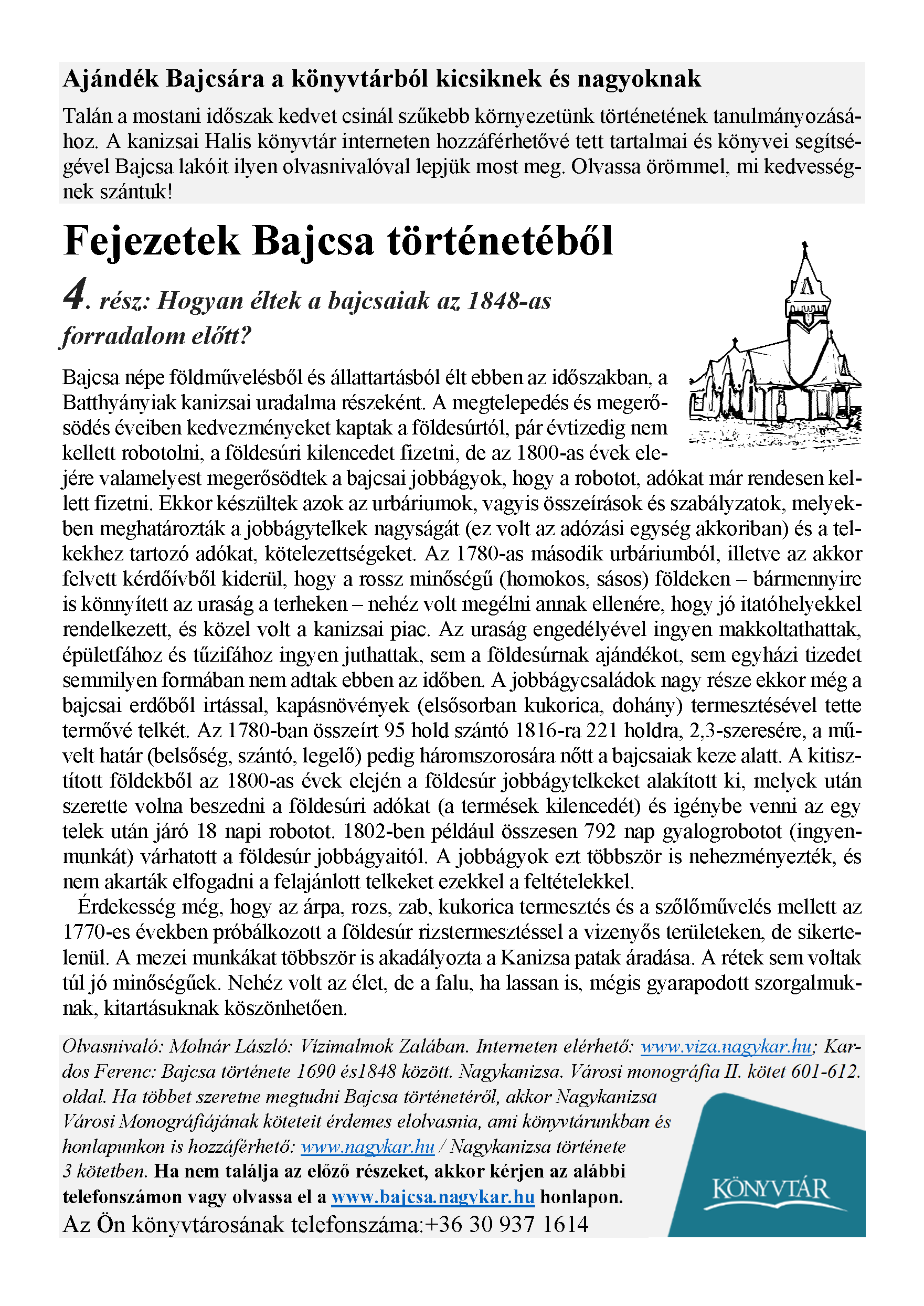 Nyilvános 1580 | 2826 | Megjelenés: 2021. május 7. | Ajándék Bajcsára a könyvtárból kicsiknek és nagyoknak Talán a mostani időszak kedvet csinál szűkebb környezetünk történetének tanulmányozásához. A kanizsai Halis könyvtár interneten hozzáférhetővé tett tartalmai és könyvei segítségével Bajcsa lakóit ilyen olvasnivalóval lepjük most meg. Olvassa örömmel, mi kedvességnek szántuk! Fejezetek Bajcsa történetéből 4. rész: Hogyan éltek a bajcsaiak az 1848-as forradalom előtt? Bajcsa népe földművelésből és állattartásból élt ebben az időszakban, a Batthyányiak kanizsai uradalma részeként. A megtelepedés és megerősödés éveiben kedvezményeket kaptak a földesúrtól, pár évtizedig nem kellett robotolni, a földesúri kilencedet fizetni, de az 1800-as évek elejére valamelyest megerősödtek a bajcsai jobbágyok, hogy a robotot, adókat már rendesen kellett fizetni. Ekkor készültek azok az urbáriumok, vagyis összeírások és szabályzatok, melyekben meghatározták a jobbágytelkek nagyságát (ez volt az adózási egység akkoriban) és a telkekhez tartozó adókat, kötelezettségeket. Az 1780-as második urbáriumból, illetve az akkor felvett kérdőívből kiderül, hogy a rossz minőségű (homokos, sásos) földeken – bármennyire is könnyített az uraság a terheken – nehéz volt megélni annak ellenére, hogy jó itatóhelyekkel rendelkezett, és közel volt a kanizsai piac. Az uraság engedélyével ingyen makkoltathattak, épületfához és tűzifához ingyen juthattak, sem a földesúrnak ajándékot, sem egyházi tizedet semmilyen formában nem adtak ebben az időben. A jobbágycsaládok nagy része ekkor még a bajcsai erdőből irtással, kapásnövények (elsősorban kukorica, dohány) termesztésével tette termővé telkét. Az 1780-ban összeírt 95 hold szántó 1816-ra 221 holdra, 2,3-szeresére, a művelt határ (belsőség, szántó, legelő) pedig háromszorosára nőtt a bajcsaiak keze alatt. A kitisztított földekből az 1800-as évek elején a földesúr jobbágytelkeket alakított ki, melyek után szerette volna beszedni a földesúri adókat (a termések kilencedét) és igénybe venni az egy telek után járó 18 napi robotot. 1802-ben például összesen 792 nap gyalogrobotot (ingyenmunkát) várhatott a földesúr jobbágyaitól. A jobbágyok ezt többször is nehezményezték, és nem akarták elfogadni a felajánlott telkeket ezekkel a feltételekkel. Érdekesség még, hogy az árpa, rozs, zab, kukorica termesztés és a szőlőművelés mellett az 1770-es években próbálkozott a földesúr rizstermesztéssel a vizenyős területeken, de sikertelenül. A mezei munkákat többször is akadályozta a Kanizsa patak áradása. A rétek sem voltak túl jó minőségűek. Nehéz volt az élet, de a falu, ha lassan is, mégis gyarapodott szorgalmuknak, kitartásuknak köszönhetően. Olvasnivaló: Molnár László: Vízimalmok Zalában. Interneten elérhető: www.viza.nagykar.hu; Kardos Ferenc: Bajcsa története 1690 és1848 között. Nagykanizsa. Városi monográfia II. kötet 601-612. oldal. Ha többet szeretne megtudni Bajcsa történetéről, akkor Nagykanizsa Városi Monográfiájának köteteit érdemes elolvasnia, ami könyvtárunkban és honlapunkon is hozzáférhető: www.nagykar.hu / Nagykanizsa története 3 kötetben. Ha nem találja az előző részeket, akkor kérjen az alábbi telefonszámon vagy olvassa el a www.bajcsa.nagykar.hu honlapon. Az Ön könyvtárosának telefonszáma:+36 30 937 1614 |