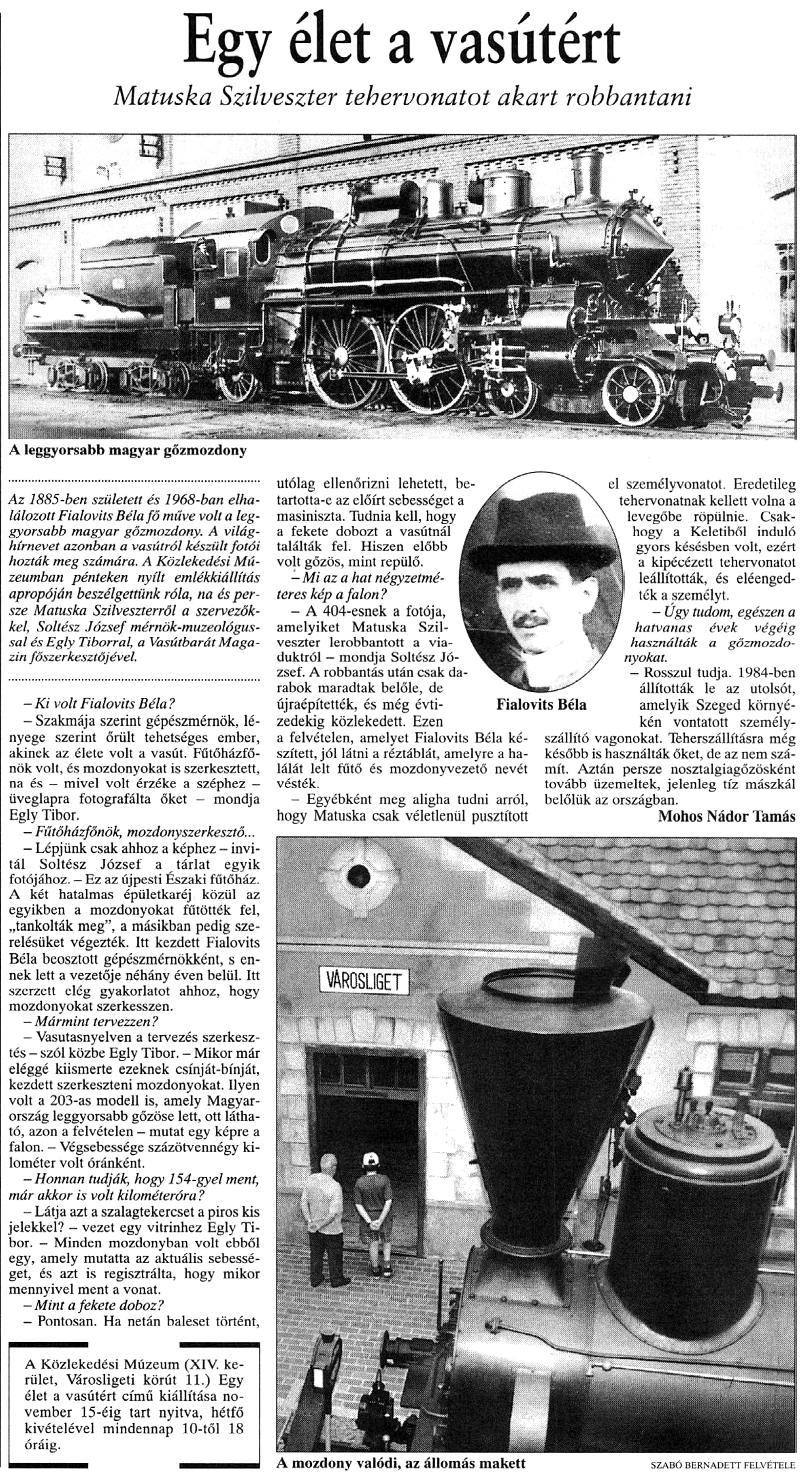 Nyilvános 979 | 1637 | Népszabadság 1999. július 13. 28. oldal | Egy élet a vasútért Matuska Szilveszter tehervonatot akart robbantani A leggyorsabb magyar gőzmozdony Az 1885-ben született és 1968-ban elhalálozott Fialovits Béla fő műve volt a leggyorsabb magyar gőzmozdony. A világhírnevet azonban a vasútról készült fotói hozták meg számára. A Közlekedési Múzeumban pénteken nyílt emlékkiállítás apropóján beszélgettünk róla, na és persze Matuska Szilveszterről a szervezőkkel, Soltész József mérnök-muzeológussal és Egly Tiborral, a Vasútbarát Magazin főszerkesztőjével. - Ki volt Fialovits Béla ? - Szakmája szerint gépészmérnök, lényege szerint őrült tehetséges ember, akinek az élete volt a vasút. Fűtőházfőnök volt, és mozdonyokat is szerkesztett, na és - mivel volt érzéke a széphez — üveglapra fotografálta őket - mondja Egly Tibor. - Fűtőházfőnök, mozdony szerkesztő... - Lépjünk csak ahhoz a képhez - invitál Soltész József a tárlat egyik fotójához. — Ez az újpesti Északi fűtőház. A két hatalmas épületkaréj közül az egyikben a mozdonyokat fűtötték fel, „tankolták meg”, a másikban pedig szerelésüket végezték. Itt kezdett Fialovits Béla beosztott gépészmérnökként, s ennek lett a vezetője néhány éven belül. Itt szerzett elég gyakorlatot ahhoz, hogy mozdonyokat szerkesszen. - Mármint tervezzen ? - Vasutasnyelven a tervezés szerkesztés - szól közbe Egly Tibor. - Mikor már eléggé kiismerte ezeknek csínját-bínját, kezdett szerkeszteni mozdonyokat. Ilyen volt a 203-as modell is, amely Magyarország leggyorsabb gőzöse lett, ott látható, azon a felvételen - mutat egy képre a falon. — Végsebessége százötvennégy kilométer volt óránként. -Honnan tudják, hogy 154-gyel ment, már akkor is volt kilométeróra? - Látja azt a szalagtekercset a piros kis jelekkel? - vezet egy vitrinhez Egly Tibor. - Minden mozdonyban volt ebből egy, amely mutatta az aktuális sebességet, és azt is regisztrálta, hogy mikor mennyivel ment a vonat. - Mint a fekete doboz? - Pontosan. Ha netán baleset történt, utólag ellenőrizni lehetett, betartotta-e az előírt sebességet a masiniszta. Tudnia kell, hogy a fekete dobozt a vasútnál találták fel. Hiszen előbb volt gőzös, mint repülő. -Mi az a hat négyzetméteres kép a falon? - A 404-esnek a fotója, amelyiket Matuska Szilveszter lerobbantott a viaduktról — mondja Soltész József. A robbantás után csak darabok maradtak belőle, de újraépítették, és még évtizedekig közlekedett. Ezen a felvételen, amelyet Fialovits Béla készített, jól látni a réztáblát, amelyre a halálát lelt fűtő és mozdonyvezető nevét vésték. - Egyébként meg aligha tudni arról, hogy Matuska csak véletlenül pusztított el személyvonatot. Eredetileg tehervonatnak kellett volna a levegőbe röpülnie. Csakhogy a Keletiből induló gyors késésben volt, ezért a kipécézett tehervonatot leállították, és elengedték a személyt. - Úgy tudom, egészen a hatvanas évek végéig használták a gőzmozdonyokat. - Rosszul tudja. 1984-ben állították le az utolsót, amelyik Szeged környékén vontatott személyszállító vagonokat. Teherszállításra még később is használták őket, de az nem számít. Aztán persze nosztalgiagőzösként tovább üzemeltek, jelenleg tíz mászkál belőlük az országban. Mohos Nádor Tamás A Közlekedési Múzeum (XIV. kerület, Városligeti körút 11.) Egy élet a vasútért című kiállítása november 15-éig tart nyitva, hétfő kivételével mindennap 10-től 18 óráig. A mozdony valódi, az állomás makett szabó Bernadett felvétele |
