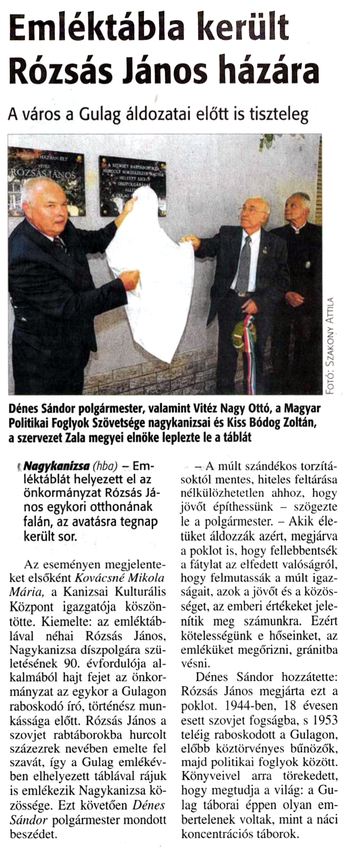 Nyilvános 703 | 968 | Zalai Hírlap 2016. augusztus 17. 3. oldal | Emléktábla került Rózsás János házára A város a Gulag áldozatai előtt is tiszteleg Nagykanizsa (hba) - Emléktáblát helyezett el az önkormányzat Rózsás János egykori otthonának falán, az avatásra tegnap került sor. Az eseményen megjelenteket elsőként Kovácsné Mikola Mária, a Kanizsai Kulturális Központ igazgatója köszöntötte. Kiemelte: az emléktáblával néhai Rózsás János, Nagykanizsa díszpolgára születésének 90. évfordulója alkalmából hajt fejet az önkormányzat az egykor a Gulagon raboskodó író, történész munkássága előtt. Rózsás János a szovjet rabtáborokba hurcolt százezrek nevében emelte fel szavát, így a Gulag emlékévben elhelyezett táblával rájuk is emlékezik Nagykanizsa közössége. Ezt követően Dénes Sándor polgármester mondott beszédet. - A múlt szándékos torzításoktól mentes, hiteles feltárása nélkülözhetetlen ahhoz, hogy jövőt építhessünk - szögezte le a polgármester. - Akik életüket áldozzák azért, megjárva a poklot is, hogy fellebbentsék a fátylat az elfedett valóságról, hogy felmutassák a múlt igazságait, azok a jövőt és a közösséget, az emberi értékeket jelenítik meg számunkra. Ezért kötelességünk e hőseinket, az emléküket megőrizni, gránitba vésni. Dénes Sándor hozzátette: Rózsás János megjárta ezt a poklot. 1944-ben, 18 évesen esett szovjet fogságba, s 1953 teléig raboskodott a Gulagon, előbb köztörvényes bűnözők, majd politikai foglyok között. Könyveivel arra törekedett, hogy megtudja a világ: a Gulag táborai éppen olyan embertelenek voltak, mint a náci koncentrációs táborok. Dénes Sándor polgármester, valamint Vitéz Nagy Ottó, a Magyar Politikai Foglyok Szövetsége nagykanizsai és Kiss Bódog Zoltán, a szervezet Zala megyei elnöke leplezte le a táblát |