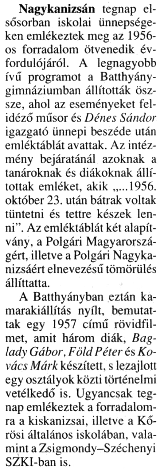Nyilvános 638 | 808 | Zalai Hírlap 2006. október 21. 3. oldal - A legtisztább forradalom - Nagykanizsa | Nagykanizsán tegnap elsősorban iskolai ünnepségeken emlékeztek meg az 1956-os forradalom ötvenedik évfordulójáról. A legnagyobb ívű programot a Batthyány-gimnáziumban állították össze, ahol az eseményeket felidéző műsor és Dénes Sándor igazgató ünnepi beszéde után emléktáblát avattak. Az intézmény bejáratánál azoknak a tanároknak és diákoknak állítottak emléket, akik „...1956. október 23. után bátrak voltak tüntetni és tettre készek lenni". Az emléktáblát két alapítvány, a Polgári Magyarországért, illetve a Polgári Nagykanizsáért elnevezésű tömörülés állíttatta. A Batthyányban eztán kamarakiállítás nyílt, bemutattak egy 1957 című rövidfilmet, amit három diák. Baglady Gábor, Föld Péter és Kovács Márk készített, s lezajlott egy osztályok közti történelmi vetélkedő is. Ugyancsak tegnap emlékeztek a forradalomra a kiskanizsai, illetve a Körösi általános iskolában, valamint a Zsigmondy-Széchenyi SZKI-ban is. |